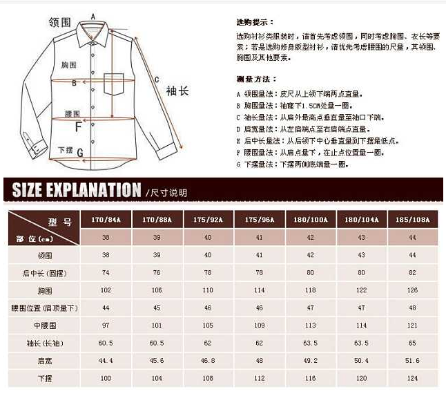 最后小编提醒:男士衬衫按照男士体型可分为偏瘦型、标准型、偏胖型。但这只是标准尺码,实际生活中因个人体型差异较大,本尺码仅作参考之用。请您在试穿之后量身选择适合自己的尺寸。