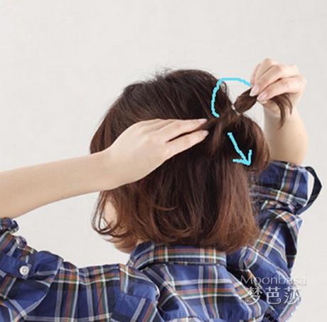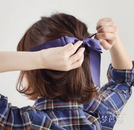 第五步:最后在两发束交结点处用蝴蝶结丝带扎起来,就可以完成这款短发扎发了。