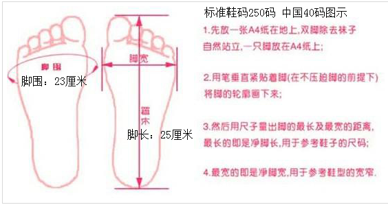 男同胞们看了上面的图,稍微有些了解,中国尺码是40码,它对应的鞋子脚长因该是250毫米,就是25厘米,对应鞋子的脚围:230毫米。计算方法是25厘米乘以2减去10。就能算出中国尺码.如此简单,